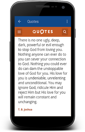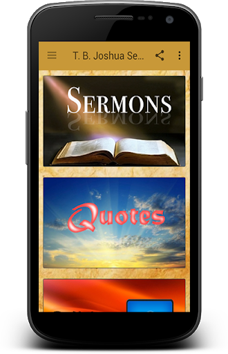 T. B. Joshua Sermons & Quotes Free app will guide you in a closer walk with God, by providing, each day, sermons thoughts upon rising and retiring. Get yourself upbeat and motivated from the word of God daily by having this wonderful app. Share with friends via Facebook and Twitter your thoughts and commentary, watch videos with his sermons and much more. We are sure that this app will help everyone to cultivate a deeper relationship with God and serve as a daily launchpad into His Word.