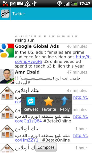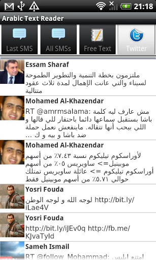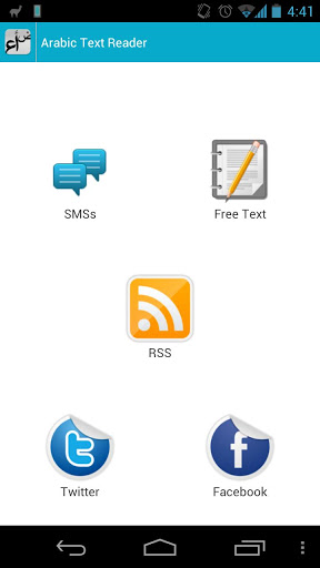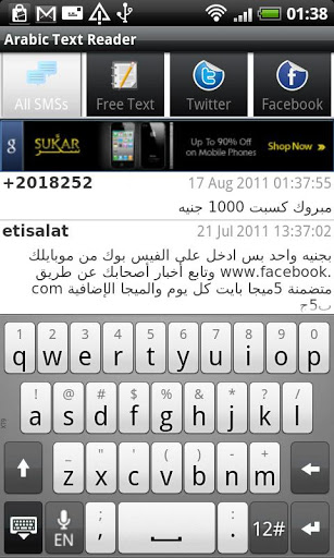 Note: Arabic Text reader doesn39;t affect other apps installed on your phone. You should use Arabic Text Reader embedded FacebookTwitter clients to be able to read Arabic content successfully.FINALLY WITH RSS SUPPORTNow you can read RSS feeds in Arabic. You can use one the popular feeds listed or add any RSS feeds to RSS reader.ALSO WITH FACEBOOK SUPPORTThis is the most update asked for by users of Arabic Text Reader. Now you can read all the Arabic feeds from Facebook that you couldn39;t read before.ALSO WITH TWITTER SUPPORTWe also added support for twitter.Now you can read all the Arabic tweets you couldn39;t read before in the same place with your SMSs.This isn39;t just another application that39;s capable of reading Arabic SMSs, it39;s different because it has the following features No need for root access. No need for font installation. If the sms sender is in your phonebook, names will be shown instead of numbers. You can filter SMSs list by sender name. You can paste any arbitrary text into the application and it will show you the text in the appropriate format. It can also read all the tweets from your twitter account and feeds from your Facebook account. Arabic KeyboardNote: Internet access permission is used for the ads, Twitter and Facebook.