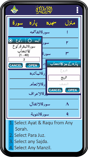 • Search with PARA, SURAH, AYAT, ROKU, MAZIL & SAJDA,