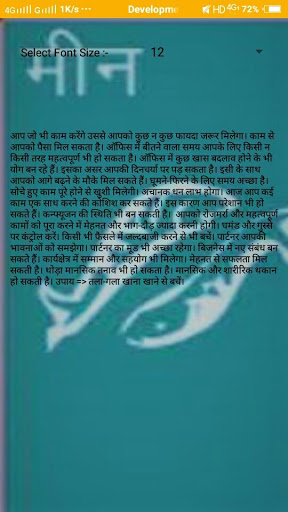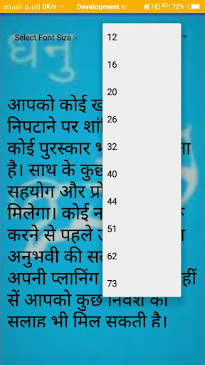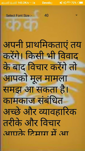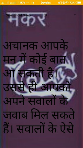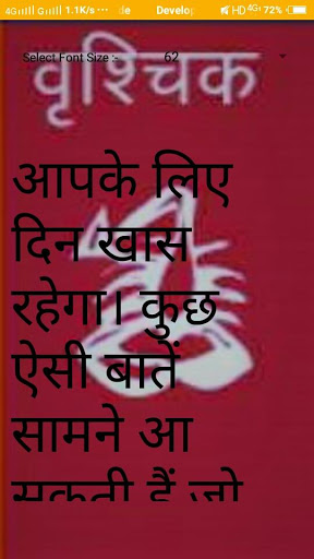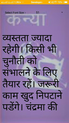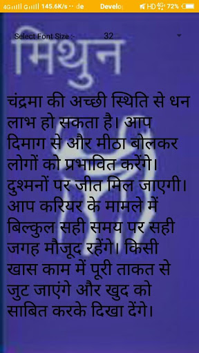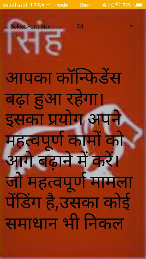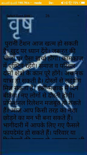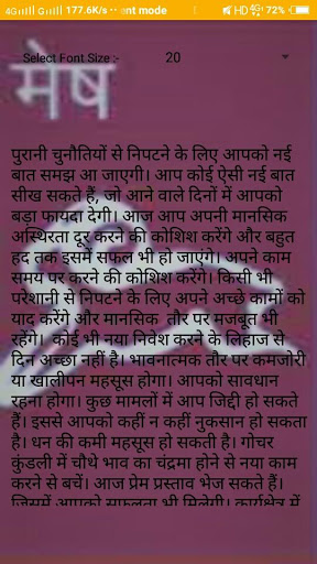 horoscope of your rashi. To know your horoscope just open the app and select the rashi to get the daily horoscope. This app will fetch the rashi details from the net will show it to your smartphone. In this app user can also increase the font size according to need.