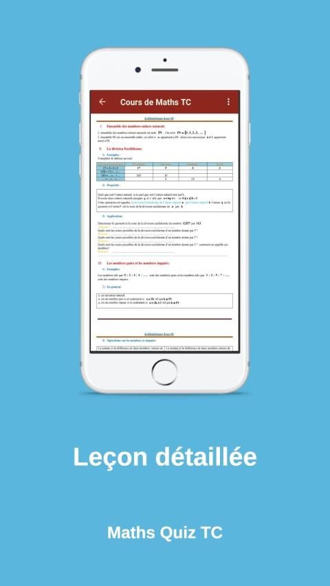 Math Quiz TC is a free math quiz game designed for high school students! It offers summaries of math lessons in addition to challenging quizzes for each lesson. Select a category of your choice, start playing and improve the level!