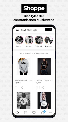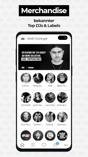 Wir zeigen Dir in unseren exklusiven Kollektionen die aktuellsten Styles aus der elektronischen Musikszene. Sieh Dir in der App das Merchandise von bekannten Top-DJs wie Tube & Berger, Loco Dice, A.N.A.L. an und bereichere Deine Festival Gaderobe mit den Lieblingsteilen der DJs. Du profitierst beim Shopping in der App von einem exklusiven Sortiment, reduzierten Artikeln und wechselnden Rabatt-Aktionen.