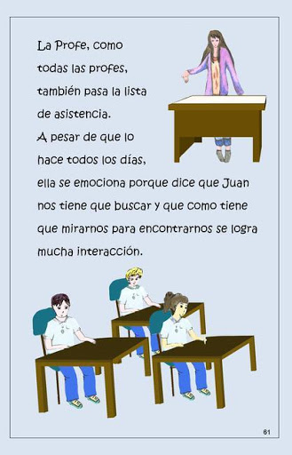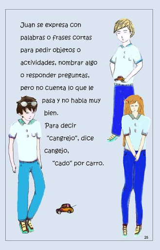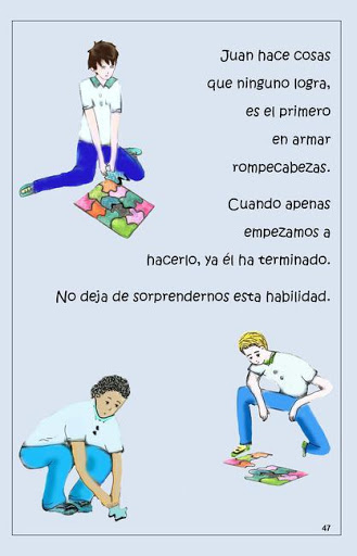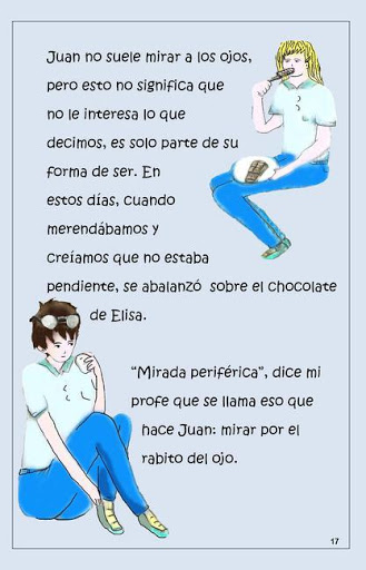 Una historia educativa donde su protagonista cuenta de su compañerito de clases, Juan, quien tiene la condición autista. En su relato se hace evidente que la maestra tiene condiciones excepcionales de sensibilidad y conocimiento de estrategias de inclusión de manera que el cuento se transforma rápidamente en una invaluable fuente de aprendizajes prácticos para docentes y familiares