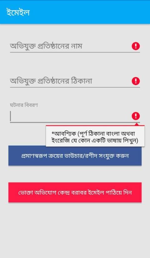 জাতীয় ভোক্তা-অধিকার সংরক্ষণ অধিদপ্তর বরাবর অভিযোগ করুন এবং জরিমানার ২৫% অর্থ পান খুব সহজে "ভোক্তা-অধিকার অভিযোগ কেন্দ্র" অ্যাপ ব্যবহার করে। গুগল একাউন্ট ব্যবহার করে অ্যাপটিতে লগিন করুন, এরপর আপনার সাথে যোগাযোগ করার জন্য ফর্মটি পূরণ করুন। এই ফর্মের তথ্যগুলো আবশ্যক অভিযোগ করার জন্য, এই তথ্য অনুসারেই আপনার সাথে জাতীয় ভোক্তা-অধিকার সংরক্ষণ অধিদপ্তর থেকে যোগাযোগ করা হবে। এরপর "অভিযোগ করুন" অপশন বাছাই করে অভিযোগ পেজে যান, সেখান থেকে অভিযুক্ত প্রতিষ্ঠানের নাম, ঠিকানা, ঘটনার পূর্ণ বিবরণ এবং ক্রয়ের রশিদ/ ভাউচারের ছবি দিন। আপনাকে একটি ইমেইল ক্লায়েন্ট ওপেন করতে বলা হবে, যেটায় লগিন করা আছে, সেটা সিলেক্ট করুন এবং ইমেইল পাঠিয়ে দিন। আপনার অভিযোগ ভেরিইফিকেশন এর পর আপনার সাথে জাতীয় ভোক্তা-অধিকার সংরক্ষণ অধিদপ্তর থেকে যোগাযোগ করা হবে।