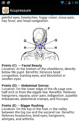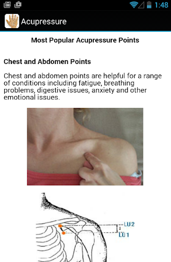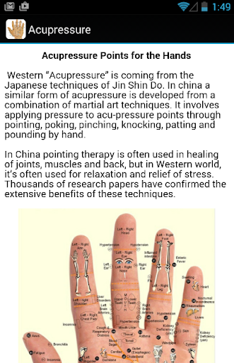 This app provides you all acupressure treatment for all diseases and shows the information about reflexology points, acupressure points, hand acupressure, neck acupressure and leg acupressure. acupressure to help you get better when you pain.