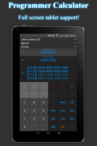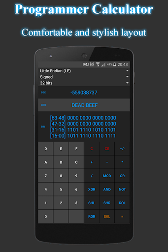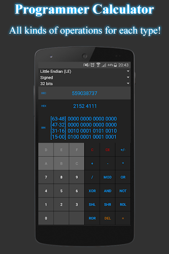 Programmer Calculator comes with a simple but pretty design and makes your decimal, hexadecimal and binary dreams come true with just a few taps of your smartphone or tablet screen!