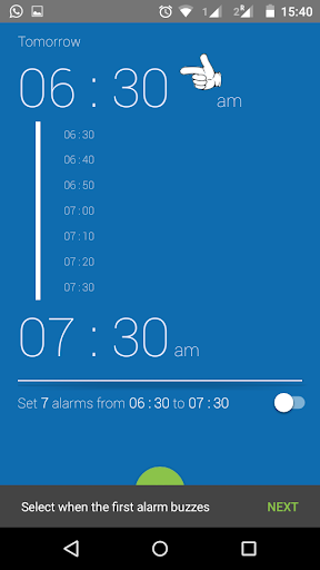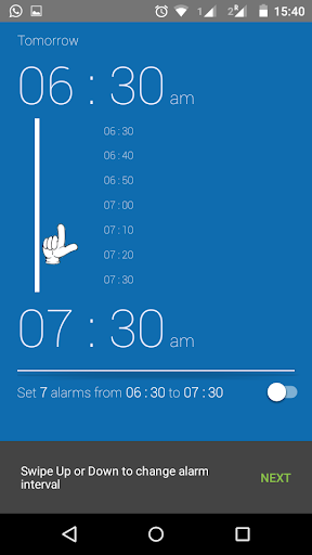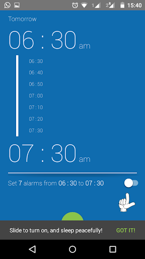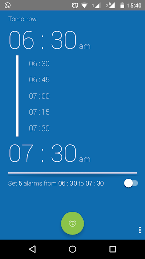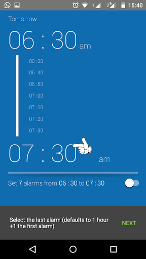 It sets consecutive alarms from a start time to an end time with a given interval, to make sure you wake up tomorrow morning. It uses the stock android clock.