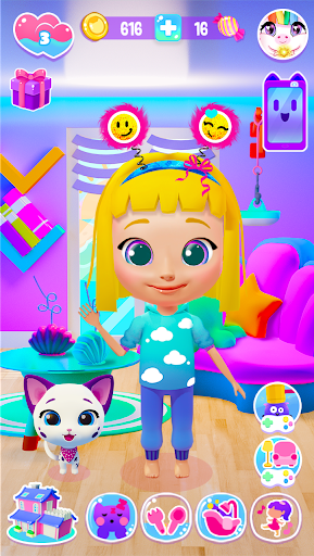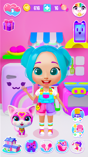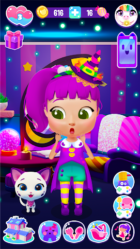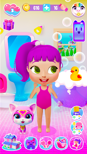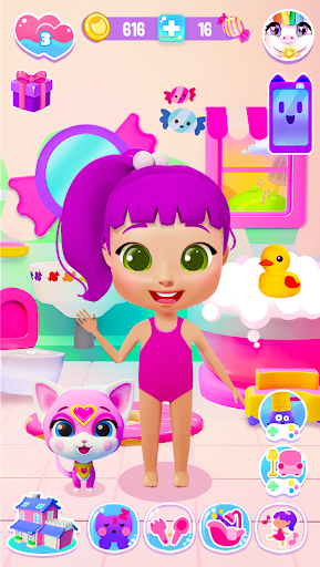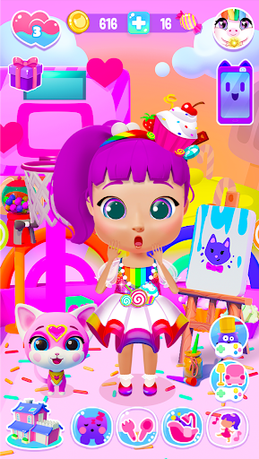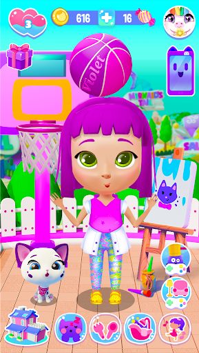 You can decorate Violet’s house as you wish by tapping on the “decoration” icon. Try out different bedframes or wallpapers, the choice is yours. You can also buy new pieces of clothing, check out all of these outfits from the store. In order to buy items, you need to spend coins and candy. That is why we created a lot of fun mini-games for you to earn money easily. For instance, one of them requires you to choose a car from our wide selection. After you have made up your mind drive it past the finish line to level up. Along the way try to collect as many coins as you possibly can. The pizza mini-game is quite simple: take your client’s order and make sure to catch all the right ingredients to be put on the dough. Avoid bombs at all costs and get a perfect match by grabbing all the items that were needed. It is time to color some drawings. Pick out the design that you want and start filling in the lines. On the right side of the screen, you will find tools like crayons, pencils, paint, stencils and so much more. Do not forget to save your drawing! Another great available feature is daily tasks. They will be given to you and if they will be completed you will be rewarded with candy. Next, take Violet’s pet to the salon. Wash off all the dirt and mud by using shampoo, brush her fur. Don’t forget to check up on Violet and her little pet every day for daily rewards!