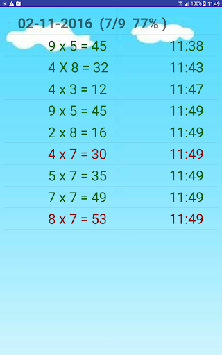 In the application there is a small area for parents. In the main screen - results are displayed the results for each day with number of correct answers / number of answers and percent. Correct answers are font color green, wrong answers font color red.