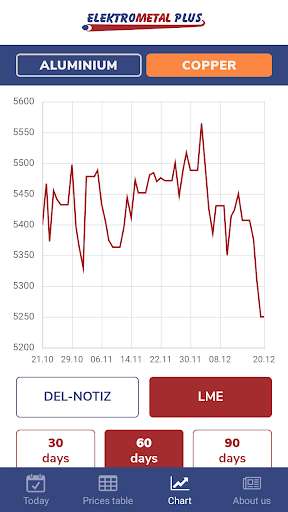 1. Today tab: Current quotation of copper and aluminium for DEL and LME metal stock exchanges, with the possibility of reviewing the price of both metals for the last 5 days.