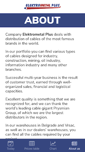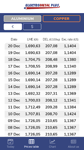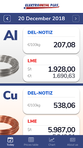 Metal Prices by Elektrometal Plus, on your smartphone provides you with daily information about quotations for the copper and aluminium.