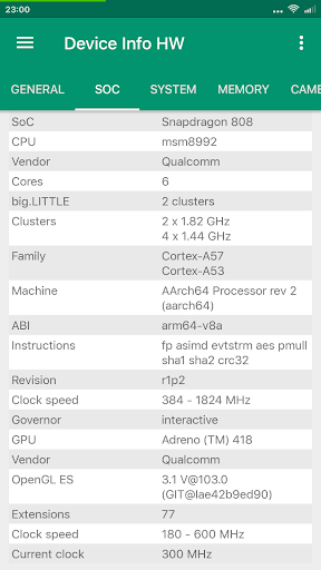 CPU : model, cores, clusters, family, abi, governor, frequency.