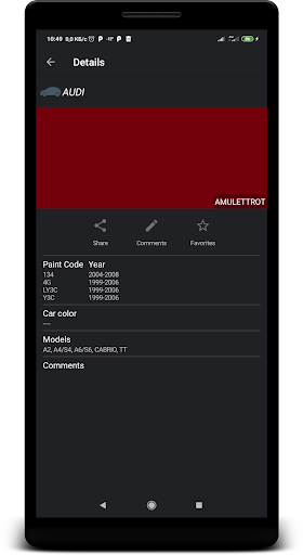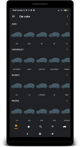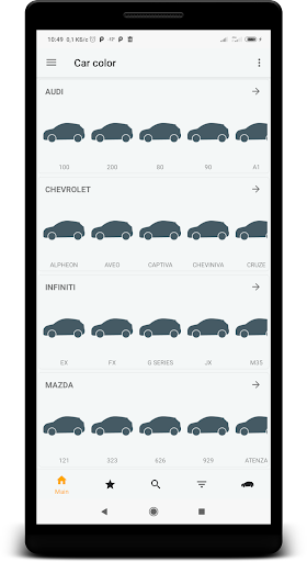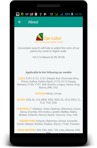 The application lists the colors of the bodies of Lada cars, Datsun, Acura, Chevrolet, Ssangyong, Lifan motors, Geely, Chery, Infiniti, Audi.