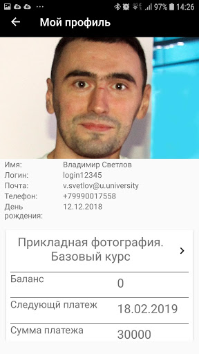 Информация о договоре на обучение, дата и сумма следующего платежа, а также график платежей, в котором отражены так же его оплаты.