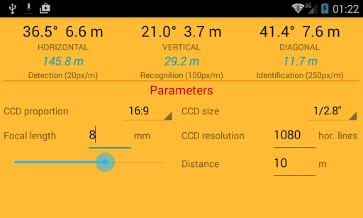 - The size of the surveyed area at a given distance (height / width / diagonal)