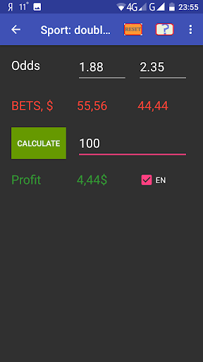 Calculate 'profit' and 'bets' values by use 'odds' as input data for sport events. Simple and suitable, most necessary things, nothing extra.