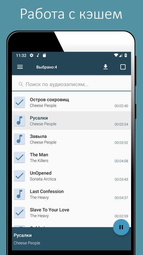 • Возможность скачать музыку с контакта, кэшировать ее и послушать ее без интернета в самом приложении;