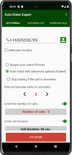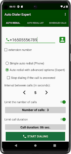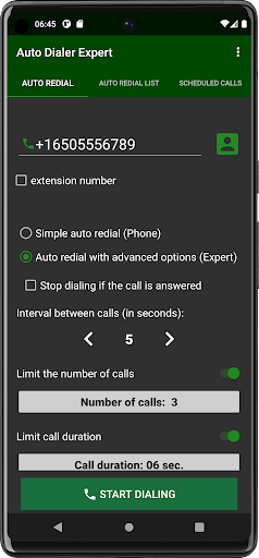 Enter your phone number and click start dialing. The program in a simple case will start dialing the phone number a given number of times. You can also limit the duration of the call.
