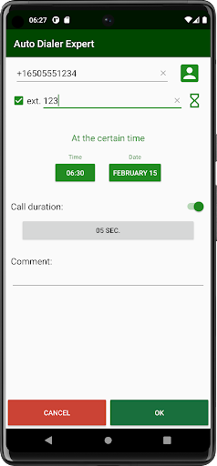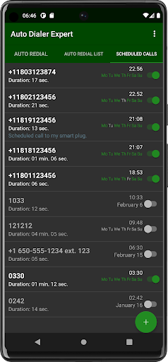 The application has the ability to schedule calls. On the last tab, add phones and a schedule for calls. In the case of scheduled calls, it is important to add the application to the power mode exception, that is, the application should not be optimized to save battery. This setting is located in the battery (or power) section of Android settings. The application does not run in the background and does not consume battery power, but in order for the system to start a scheduled call at exactly the specified time, it must not be a low priority in the system.