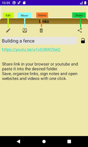 Save links directly from third-party applications (browsers, youtube or any other), divide them into categories and folders as you wish. Open websites and videos directly from your notes.