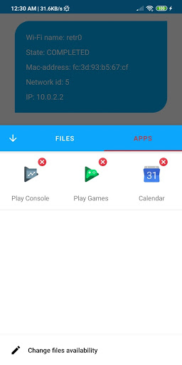 An application for creating or connecting to a room via Wi-Fi and adding applications and files to the shared file for downloading.