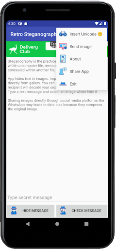 👍 Retro Steganography App hides text inside images. Import and save your images directly from gallery. You can send image via e-mail and recipient will decode your secret text. Type a text message, press the button and select an image where hide it.