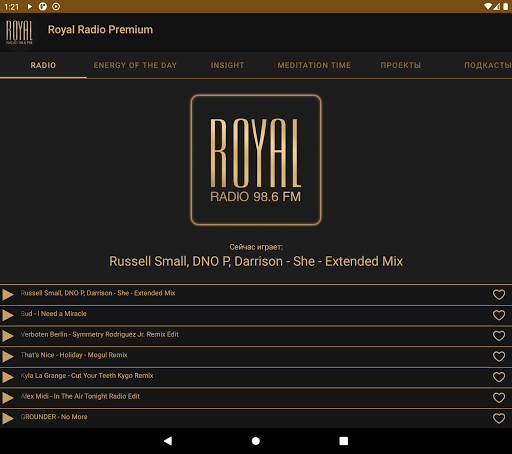 ROYALRADIO - это премиум волна из Петербурга с современным и гармоничным контентом. Мобильное приложение ROYALRADIO PREMIUM дает возможность не только иметь постоянный доступ к современной легкой музыке от самых трендовых лейблов, но и предоставляет, в рамках платной подписки, возможность слушать уникальный продукт радиостанции: аффирмации и медитации, составленные профессиональными психологами, помогающие улучшить настроение и создать правильную атмосферу в любое время дня и ночи.