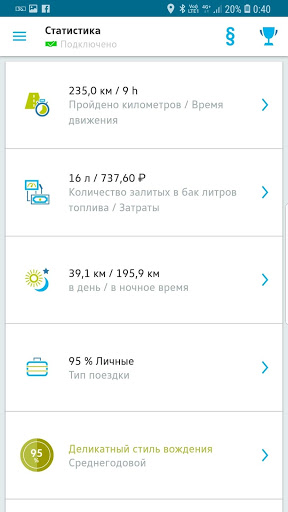 Обзор пройденного расстояния и времени в пути, потреблённого топлива и затрат на него, сортировка по типам поездок (деловые, личные, поездки на работу) и многие другие параметры.