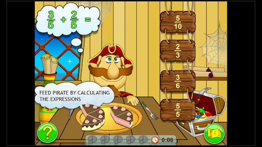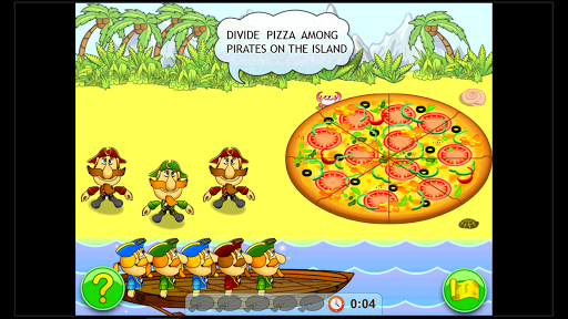 On the first island the player learns to read fractions. In order to do so he/she offers the pirates some slices of pizza and try to guess what part of the pizza is left for other pirates to eat in the boat. If there is a mistake the pirates get in trouble.
