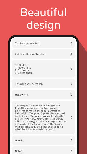 Simple Notes takes up very low memory on the phone and stores notes in a local database. This allows you to use the app even on devices that have almost no memory. The app interface can be translated into one of two languages (English or Russian).