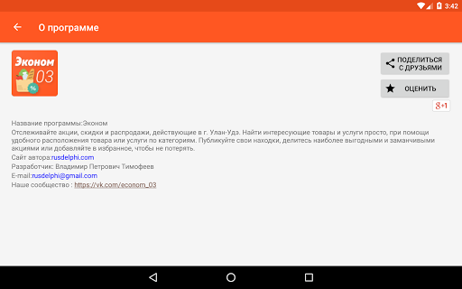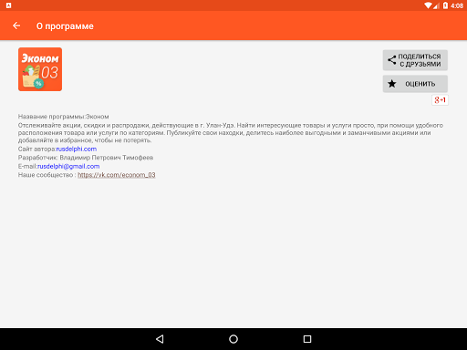 , как в приложении так и в группе Вконтакте: https://vk.com/econom_03. Таким образом, Вы сможете спланировать свой шопинг, выбрав самые выгодные предложения и маршрут. Найти интересующие товары и услуги просто, при помощи удобного расположения по категориям: