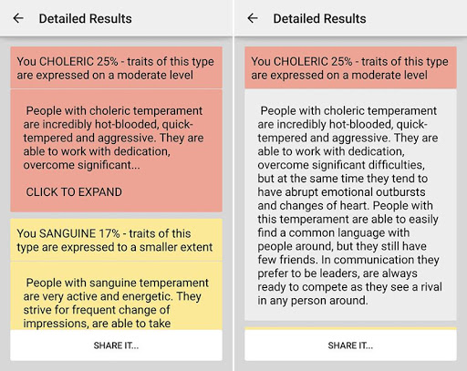 it is very interesting to see what temperament matches us. I wish we could save our results as a PDF file or something like that just to remember what the results were. I also wished there weren't any colours for each question because it gives a clue what temperament it is linked to.