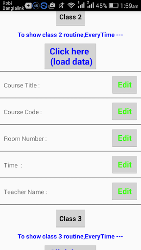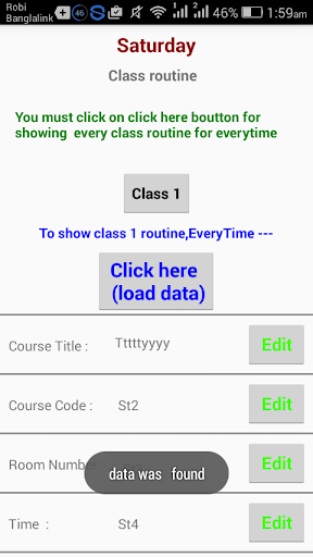 School , college and university students need to gather class routine and everyday attend their institute within mandatory time also teacher . Sometimes they forget their class time and for this reason they can not attend their class in mandatory time . So this app help them . They can edit their class time course title ,course code and teacher name and save in android phone . When the forget their class time , they can see class routine from android phone. -
