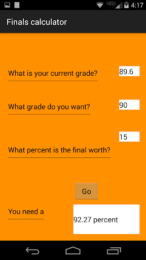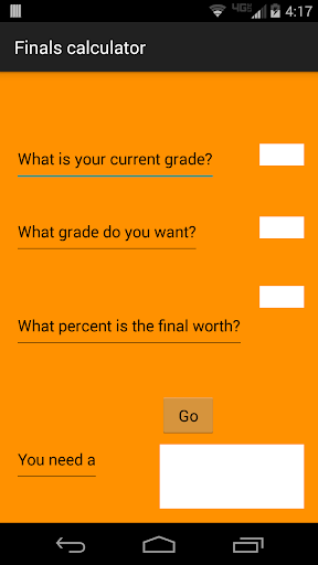 Ever wondered what you need to get on your final? Simply put your current percent in the class, your target percent, and the percent the final is worth into the app, and it will tell you what you need to get, just like that! Whether you are hoping to move up a letter grade or simply hang on to your current grade, you can find out what you need to get. Comes in a bright orange color for added happiness.