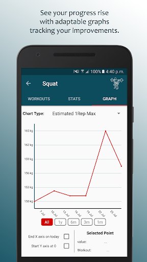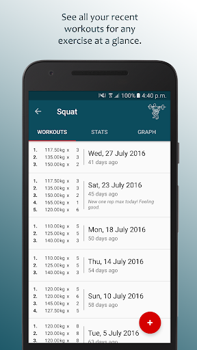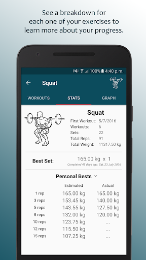 - Detailed stats page will tell you your best set, how many workouts you've had, your estimated one rep max and much more