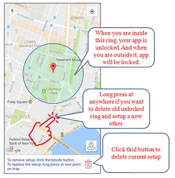 - User will setup a area on google map where the app will be allow to use. Everytime, The AppLock will detect current location of device to determine whether the app is allowed to use or not.