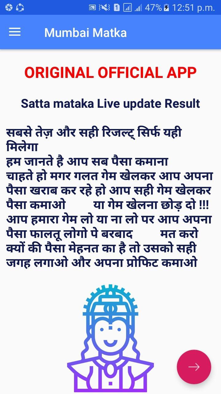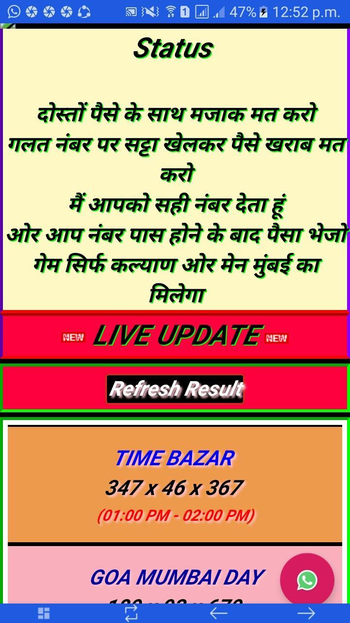 This is the fastest satta matka live result application. we will give all results like kalyan,mainmumbai,kalyanbazarday,goa mumbai day and others also.