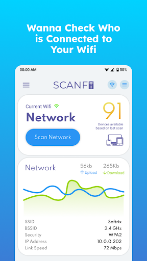 Use our ScanFi to scan your local network Lan or Wifi on any Android device. User-friendly interface and free features of scan wifi allow you to scan and analyze all devices connected to your network, selected IP range, linked IPs, and connect with shared wifi by free scanning the wifi password with Wifi QR code reader and scanner.