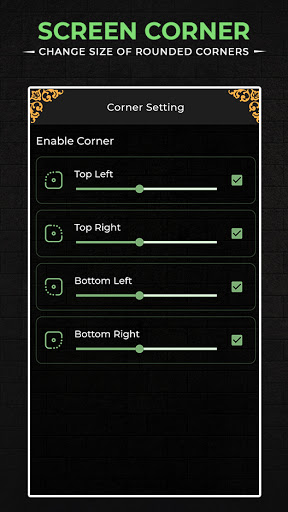 Furthermore, the Round Corners even allows you to set specific looks for individual apps so you can opt to minimize or even turn off its effect entirely when launching certain apps, and highlight it when using others. Round Corner Screen allows you to feel the smoothness of the curved screen and rounded corners such as the top phone. You can also change corner background colors as you like. Control the Corner radius to make it more perfect.
