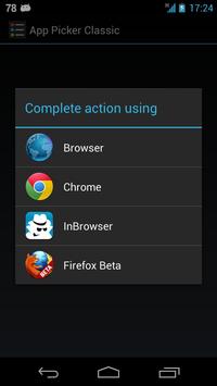 Don't like the app picker interface in Jelly Bean? Have you installed multiple browsers or other "duplicate" apps and want to be able to choose which one to run each time, with just one tap? Tired of having to tap two times to start your third party apps? App Picker Classic solves that problem by creating a UI similar to the one in ICS where you only have to tap once to select the preferred application.