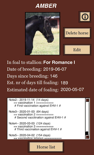 This app calculates and displays the estimated due date for the birth of the foal based on an average gestation period. The app can also send notifications of when to do ultrasounds, vaccinations or other activities of choice.