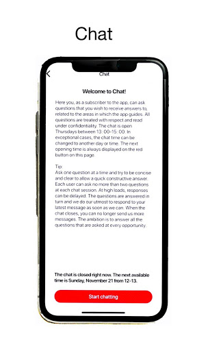 Payment is made inside the Application. You need to purchase a one month automatic renewal subscription to access all the features of the app. When you start your subscription you will get access to all chapters and chat with a professional adviser. You have access to the complete app during the subscription time.