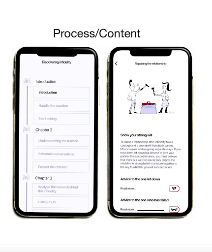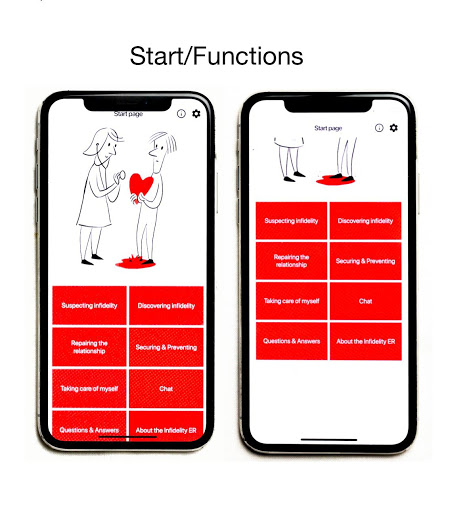 In the Infidelity ER you are guided, individually or as a couple, step by step through the same processes as at the therapists office. The purpose of the app is to reach more people in need of support, who might not have the possibility, resources, time or will to attend a therapists office