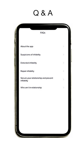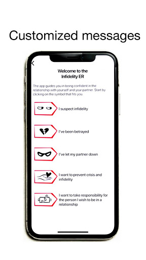 You will receive help and support to handle both feelings and behaviors through every step of the different phases; from suspected to confirmed infidelity and further on to repairing the relationship. There are also two following processes that help you build a stronger, more open and happy relationship, as well as increasing your own awareness. You get advice, support and knowledge, and the possibility to write down your own thoughts and reflections, anonymous of course. You will also get access to a chat where you can ask personal questions about specific circumstances that you need help to understand. The Infidelity ER is available in your mobile phone whenever you need it, and works as a guide through the different phases that inevitably follow infidelity, but also as an “education” in handling relationships and your own emotional luggage.
