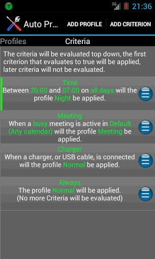 Auto Profiles can select a profile automatically, for example, you can have the profile ‘Night’ applied between 11PM and 7AM on weekdays and is silent for all but white listed numbers. When you arrive at work and your phone connects to the office WLAN, it automatically selects the profile ‘Work’. When you leave the office for lunch Auto Profiles applies the profile ‘Normal’ and when a meeting occurs in your calendar will the profile ‘Meeting ’ be applied, when you are at the golf course will the profile quiet be applied.