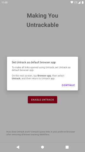 When a link is opened using Untrack, all known tracking parameters will be removed, and then opened in your preferred browser.
