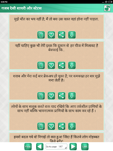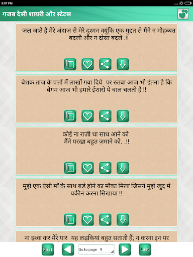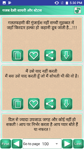 हमनें इस एप्प में गज़ब हिन्दी शायरी और status messages को शामिल किया है जिन्हें आप अपने social sites पर इस्तेमाल कर सकते हैं. social नेटवर्क पर अपनी दिल से जुडी बातों को स्टेटस बनाकर दूसरों से शेयर करना आजकल एक प्रथा सी बन गया है.