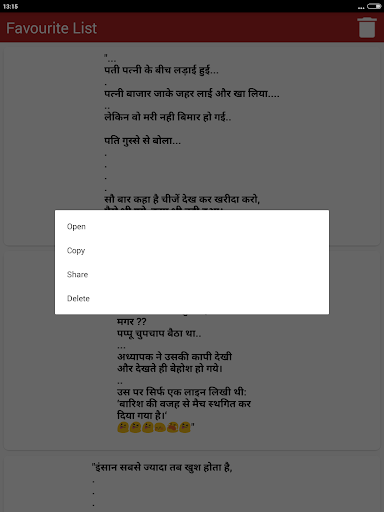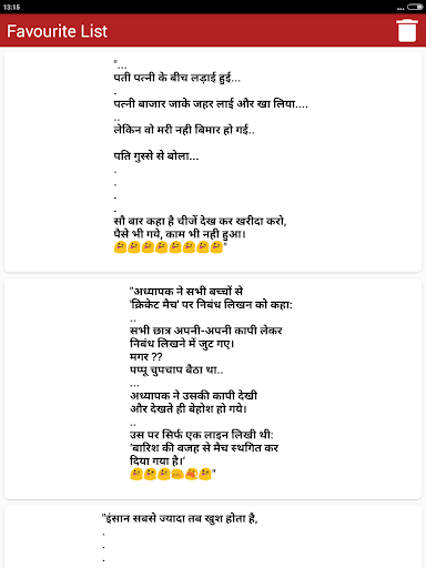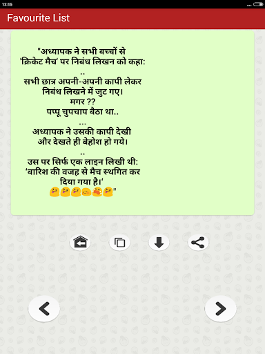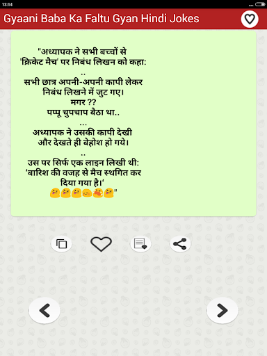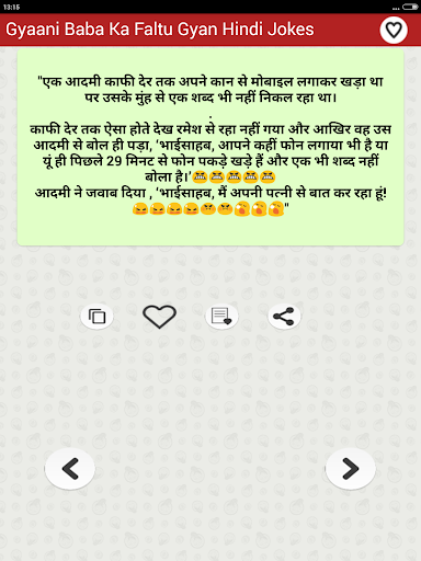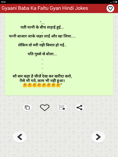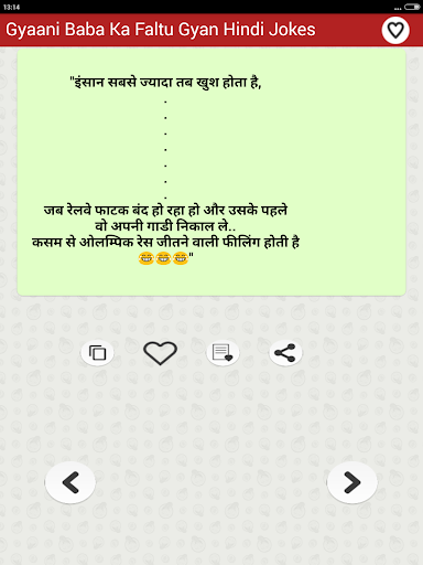 The collection of top most funny & entertainment Hindi Jokes that you can Enjoy sharing with your friends and family members over social networking sites. You can download share or send any joke by just a single tap on social media websites such as Facebook Instagram twitter Linkedin etc as well as on chat messengers such as WhatsApp Snapchat Hike etc. You can also save Jokes as text or as Picture in JPG or PNG Format to your mobile phone internal storage memory or in your cell Phone SD Card and can share later as photo.