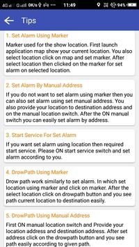 This application provide to set location alarm easily. User also set alarm in two types. First one is click on marker. In which select the location and click on location marker. Second one is provide manual address location and set location alarm according to given address or location. User also see path own location to destination location. In which provide location by marker or manual address location.