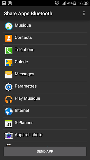 By selecting an Application in the list and clicking on the Send Button you are allowed to share Applications between Android Phones per Bluetooth.